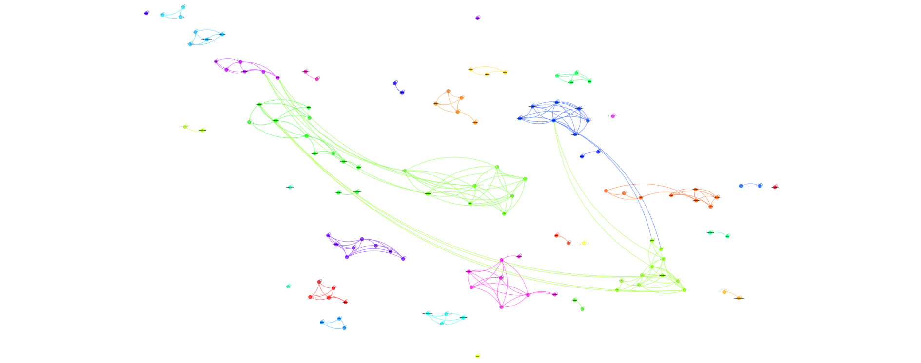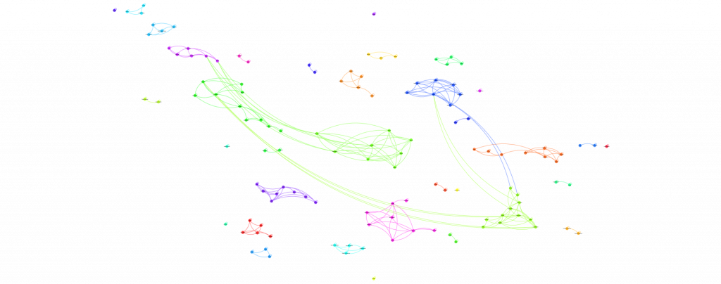 L’algorithme fait appel au web service Teeft qui extrait les mots-clés d’un corpus de résumés en anglais. Les poids des nœuds et arêtes sont calculés en fonction de leur fréquence d’apparition. Un seuil d’affichage dynamique des nœuds et des arêtes est également présent. Ensuite, l’algorithme Louvain Communities est appliqué pour avoir un partitionnement du graphe (originellement en 3D). Une projection en 2D et un algorithme personnalisé sont ensuite appliqués pour rendre le graphe plus visuel.